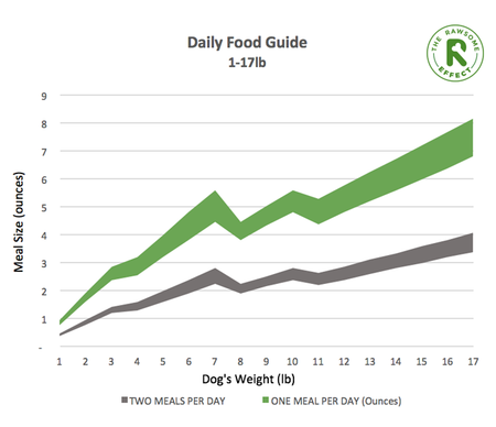As a general rule for feeding raw foods, dogs should be fed 2-3% of their ideal body weight; this will vary due to your dog's energy and activity levels. If your dog is highly active or a working dog breed, you should portion about 5% of your dog's ideal body weight.